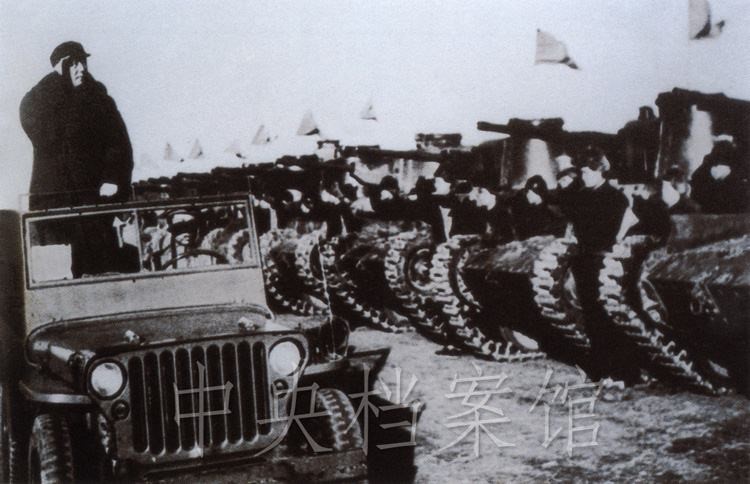 紀(jì)錄片:(群眾呼聲)中國(guó)人民萬(wàn)歲!(紀(jì)錄片解說(shuō))檢閱開(kāi)始了。東北野戰(zhàn)軍參謀長(zhǎng)劉亞樓將軍,向毛主席報(bào)告受檢閱的部隊(duì)全部到齊。坦克塔上飄揚(yáng)著紅旗,坦克手精神百倍,向著自己的領(lǐng)袖敬禮。